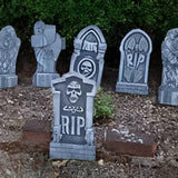 Set the scene for a frightful night with this set of 4 Halloween tombstones, each featuring eerie designs to give your home or yard a haunted cemetery look.